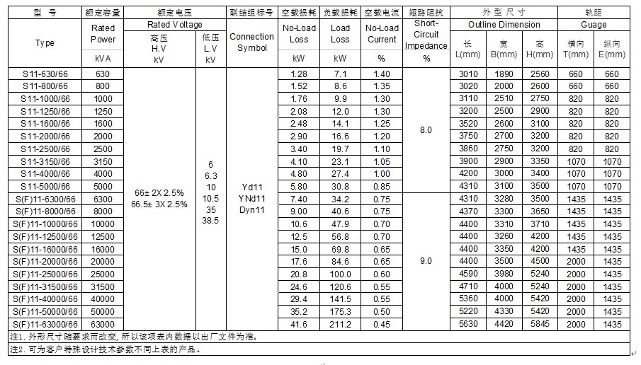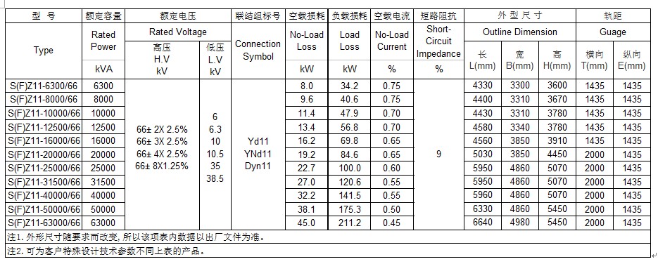 66kV 630~63000kVA三相雙繞組無(wú)勵(lì)磁調(diào)壓電力變壓器性能參數(shù)表