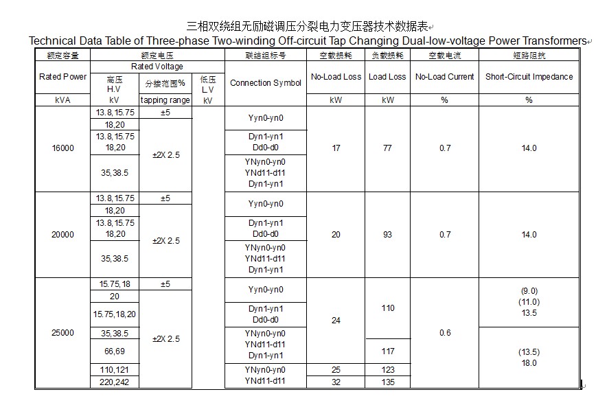 三相雙繞組有載調(diào)壓分裂電力變壓器技術(shù)數(shù)據(jù)表