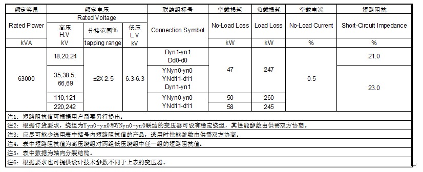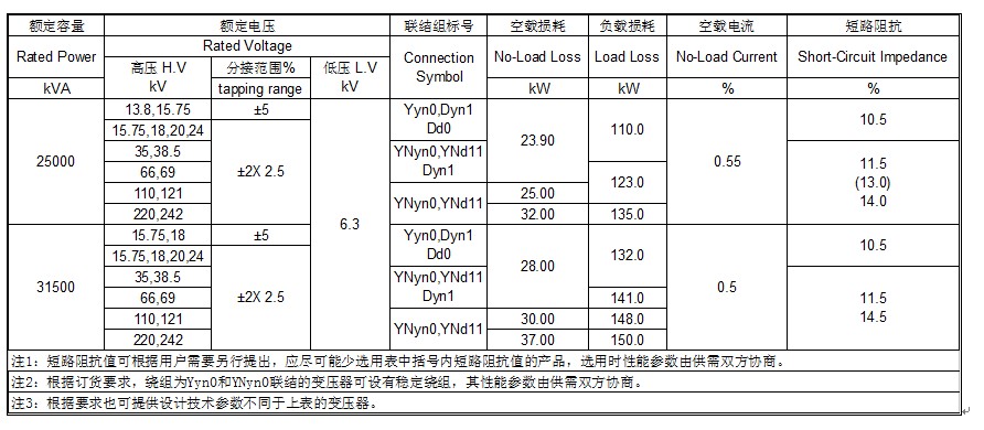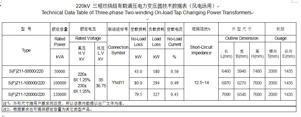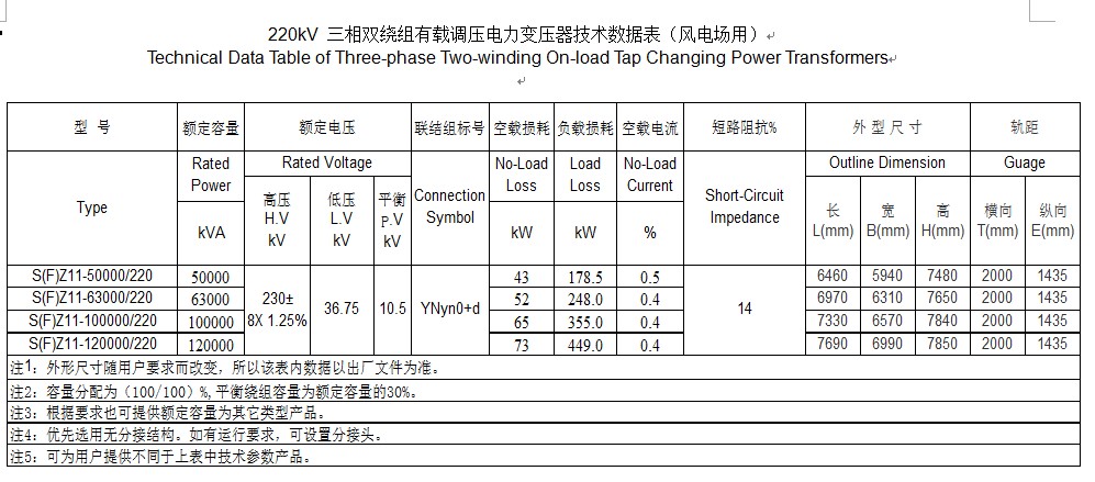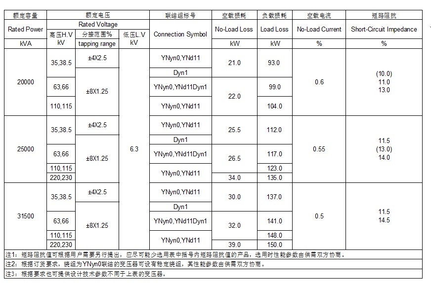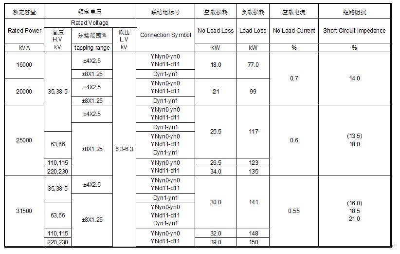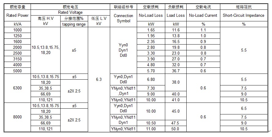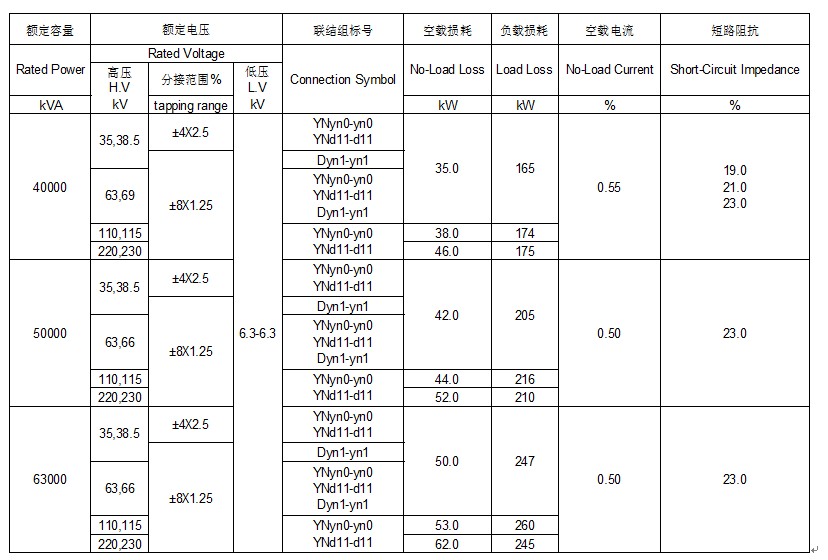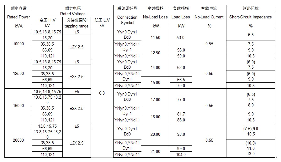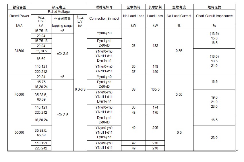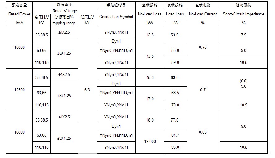 三相雙繞組有載調(diào)壓電力變壓器技術(shù)數(shù)據(jù)表